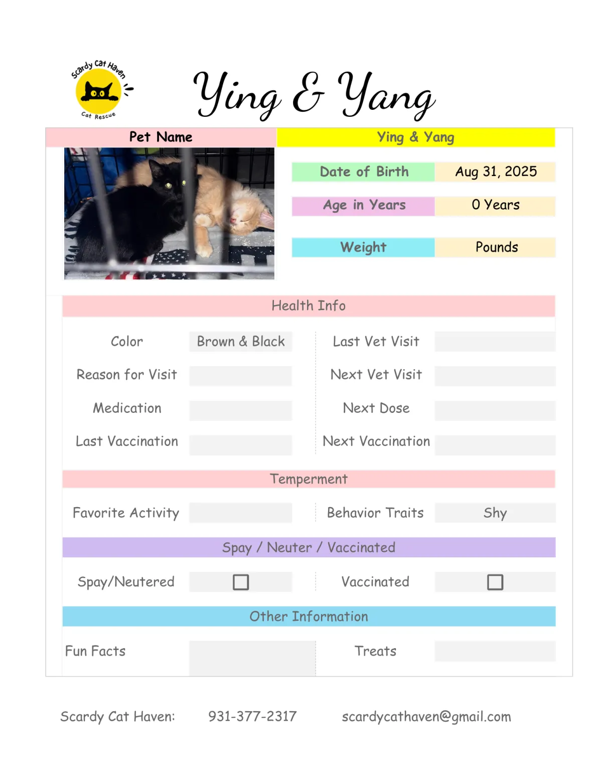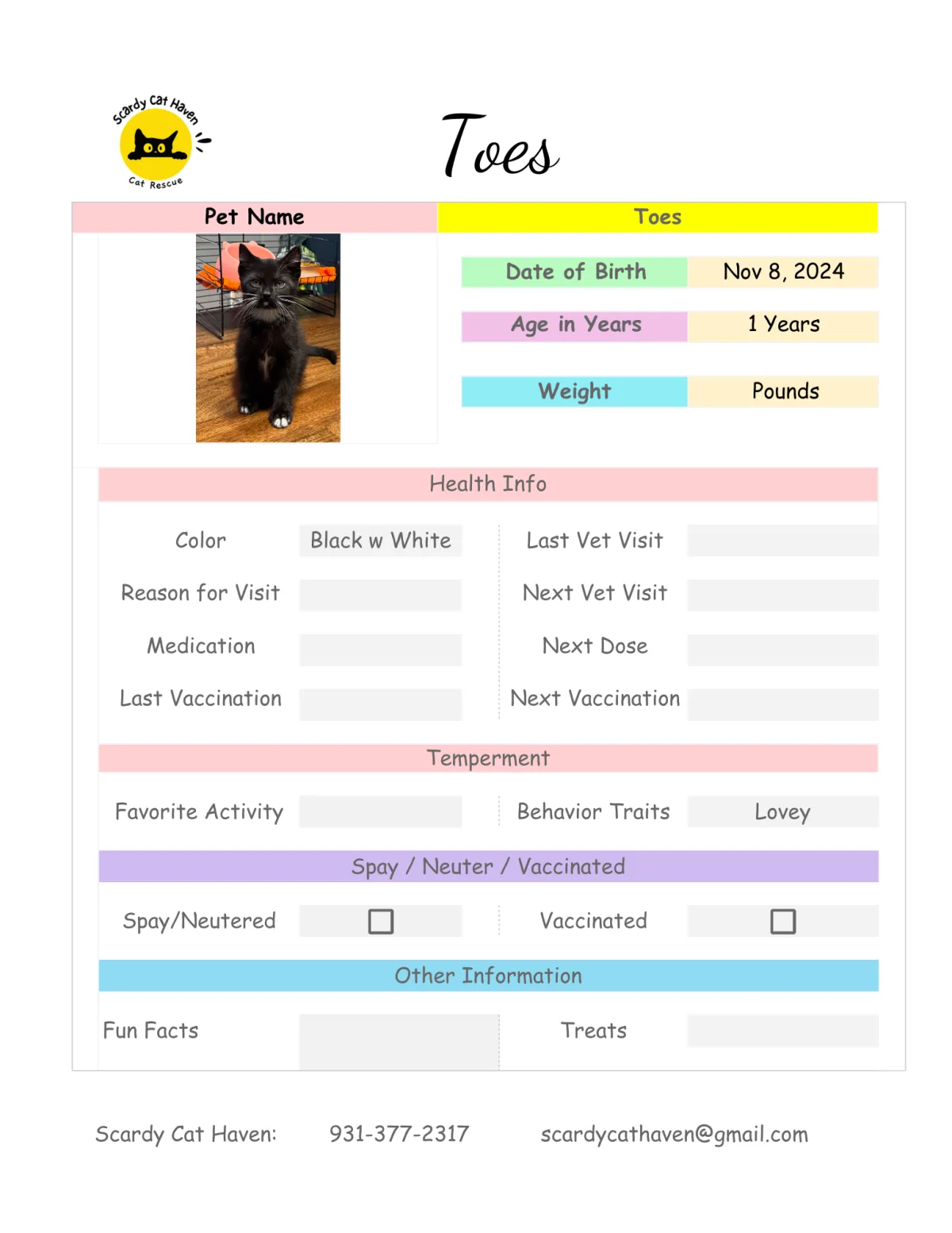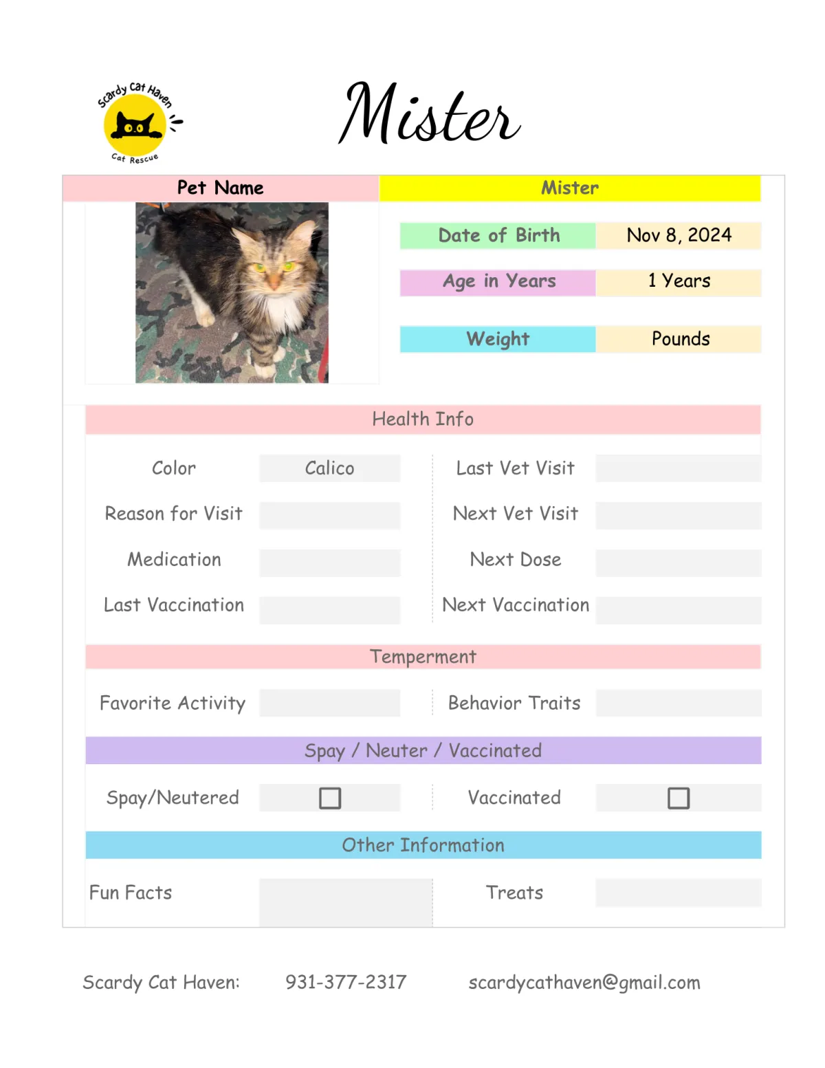 I agree to adopt above named cat from Scardy Cat Haven (herein referred to as the RESCUE on the date above for the sum of $50.