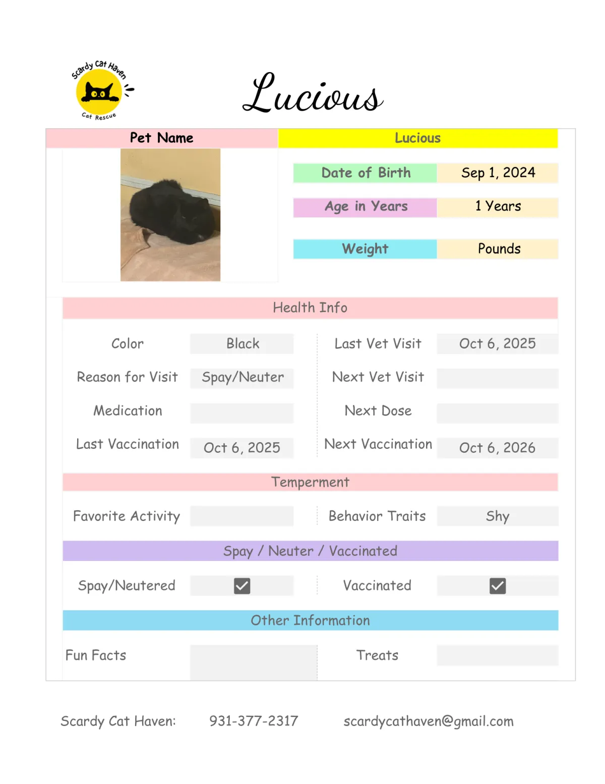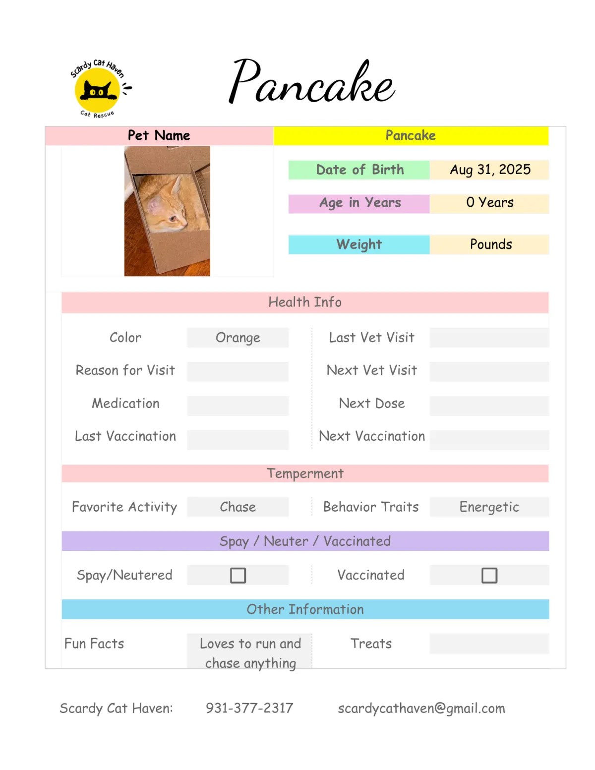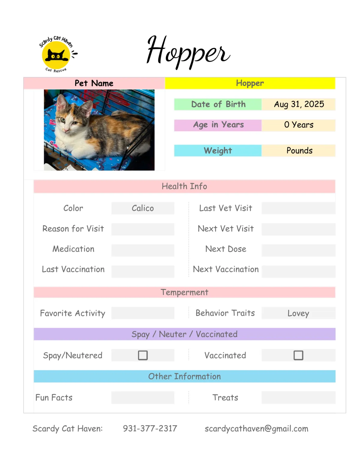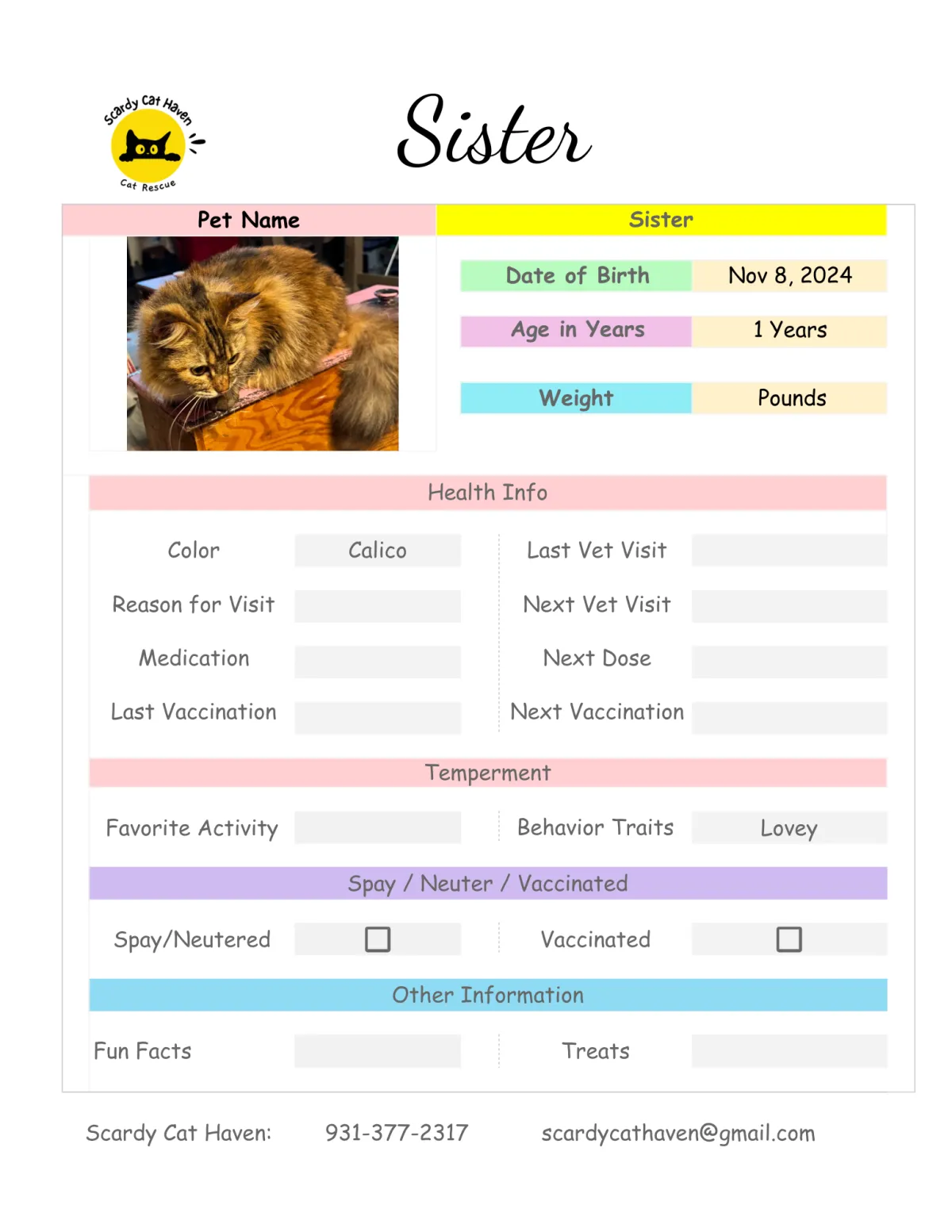 I agree to adopt above named cat from Scardy Cat Haven (herein referred to as the RESCUE on the date above for the sum of $50.